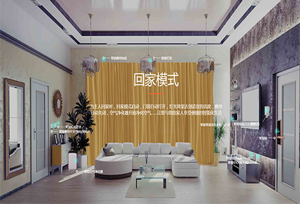 客廳也采用了智能場(chǎng)景,可以一鍵操控,更換客廳中的景色,而且智能音響也可以根據(jù)場(chǎng)景和燈光的變化播放不同的歌曲。